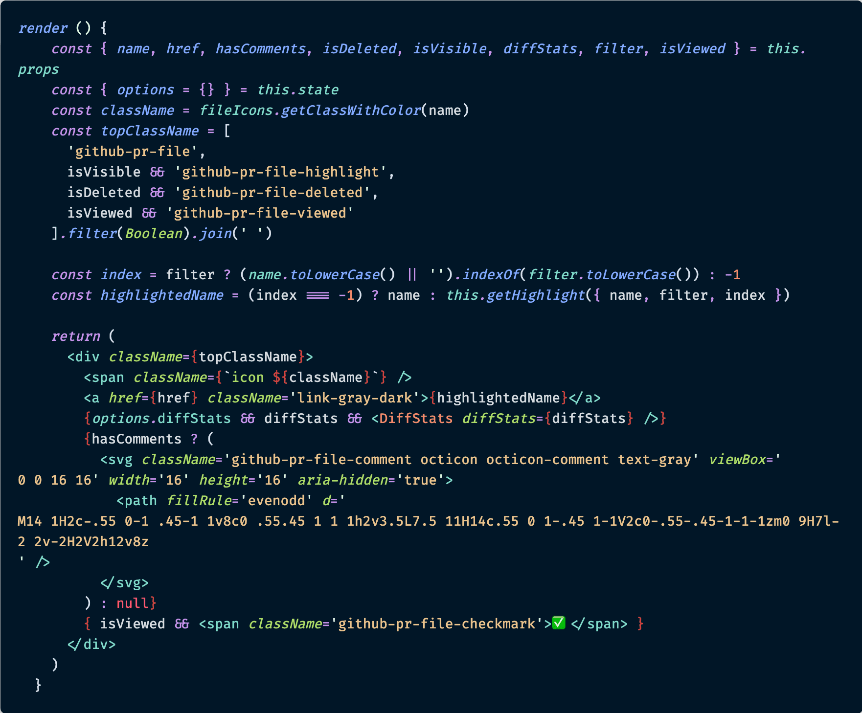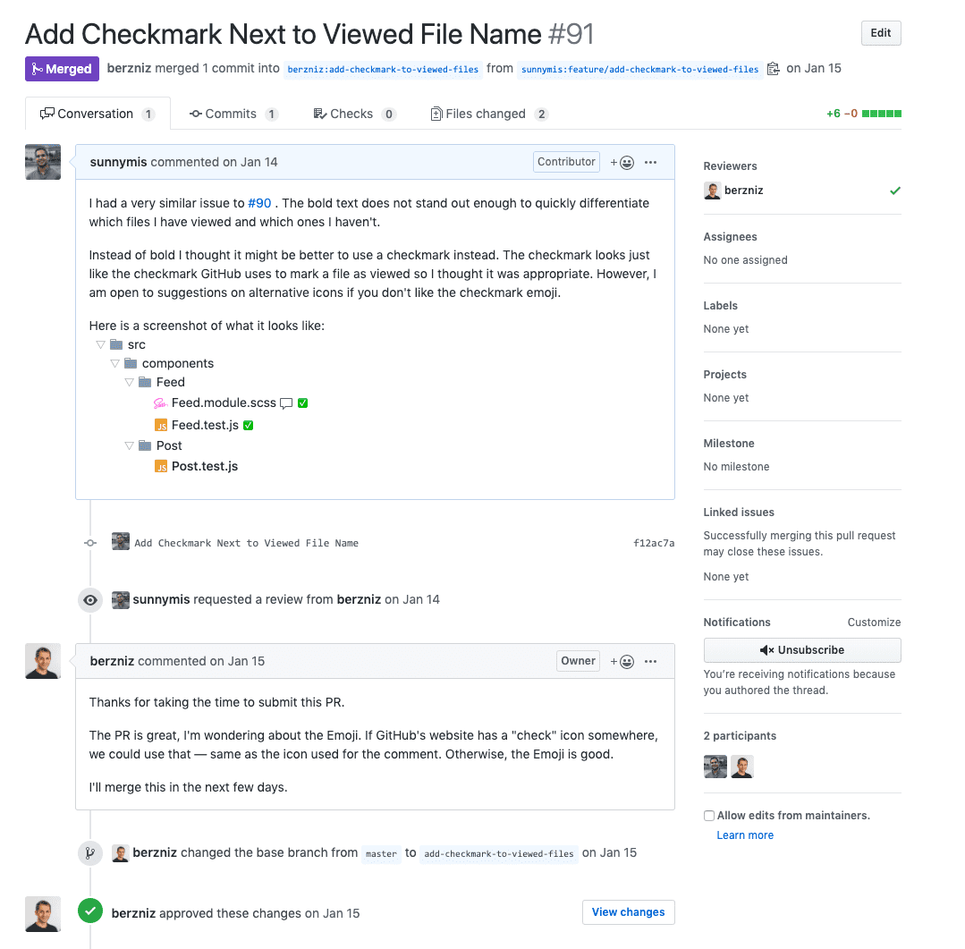 My first open source contribution was to a project called Better Pull Request for GitHub. It’s a chrome extension that adds a file tree to GitHub pull requests to improve the code review experience. I was using it for a few weeks and kept running into the same issue over and over: when viewing the file tree it was hard to tell which files were already viewed and which weren’t.