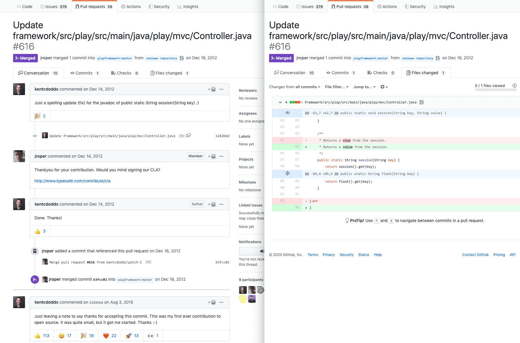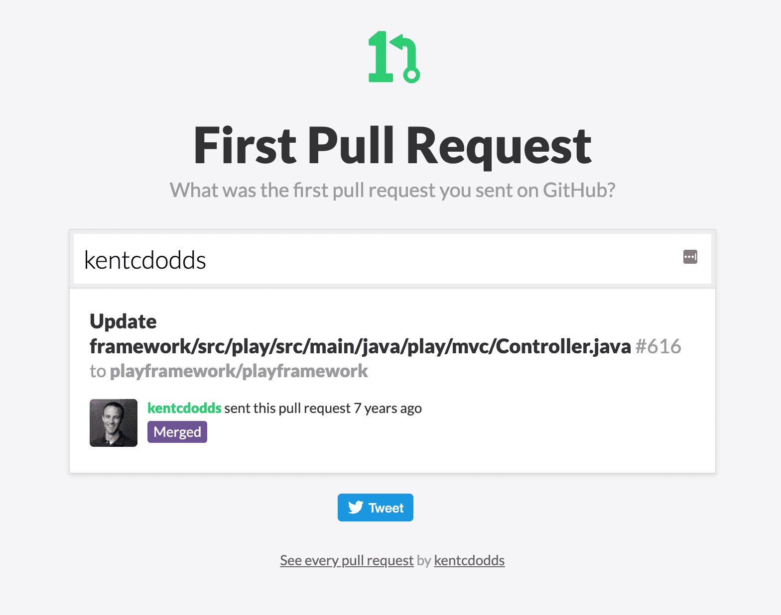 The site firstpr.me shows you the first public pull request for a given GitHub user. A great example of a very active open source contributor who began with small contributions is Kent C. Dodds. His first PR was fixing a typo in a javadoc. This is a much smaller pull request than the one I made.