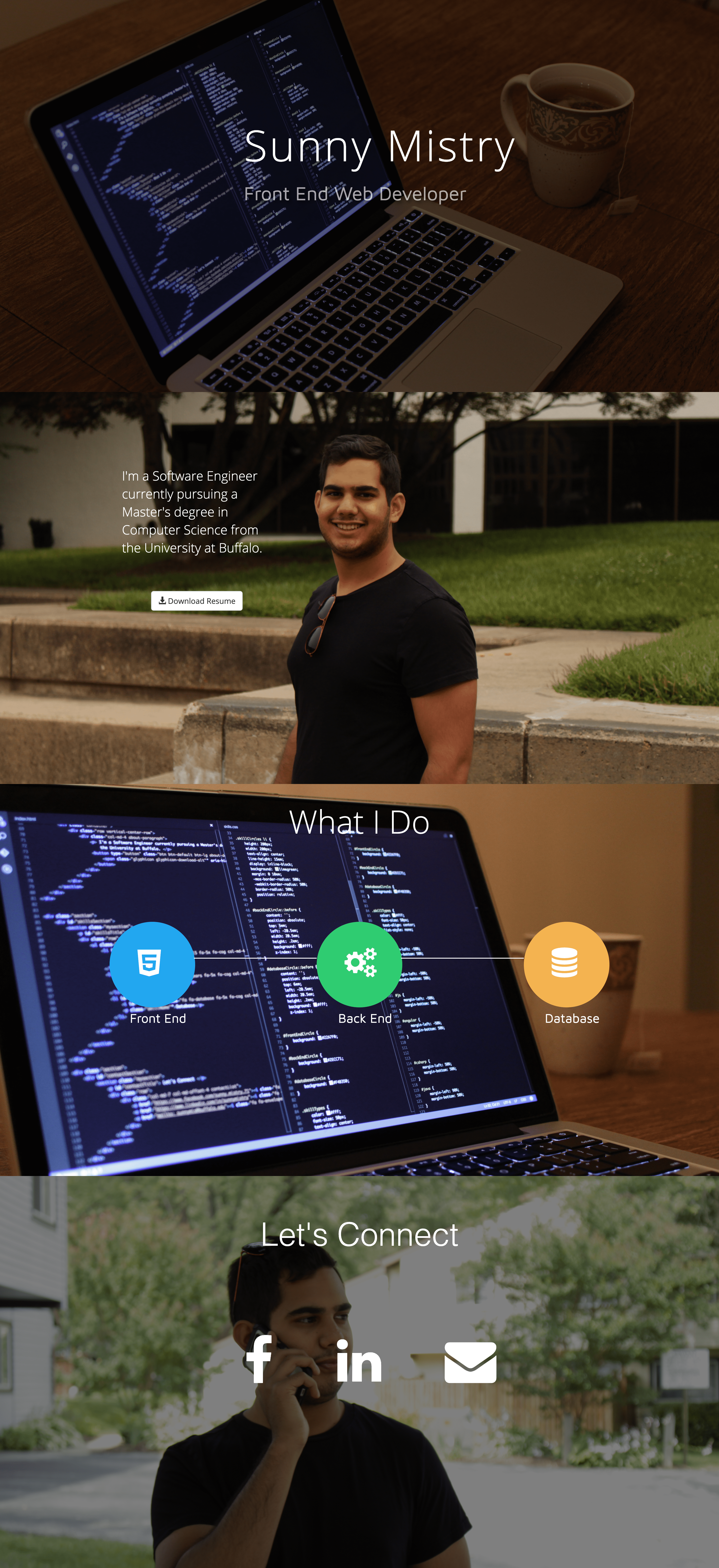 That summer, I built my first website. It comprised of four full width, full height screens with wallpaper background. There was a title screen with my name and description, an about me screen with a link to my resume, a screen that showed I was a full stack developer, and lastly, a contact me screen. The site included a feature that hijacked the native browser scroll and scrolled down just enough to show the next screen. The subtitle under my name rotated through 3-4 phrases and animated in a way that looked as if it was being typed across the page. Yes, the wallpaper size photos of me were a bit too much. The stock photos of the laptop and mug were taken by me.