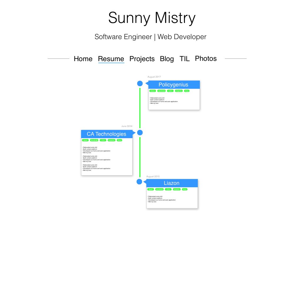 This time I didn’t hijack the browser’s scroll. I didn’t include any wallpaper size photos, but instead I put a massive cropped photo of myself. The site featured a left rail containing links to different pages on the site and everything to the right of the rail was scrollable content. Instead of linking to a resume hosted in a bucket somewhere, I decided to create an online resume by building a timeline. This made it much easier for someone to see what I’ve done, what technologies I’m familiar with, and, most importantly, my ability to write decent CSS.